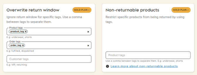The Overwrite Return Period feature allows you to bypass the standard return deadline in certain cases, based on tags assigned to the productsorders, or customers. This means that even if the default return period has passed, returns can still be requested if the specific tags match. This feature is available for users on the Gold + pricing plan.