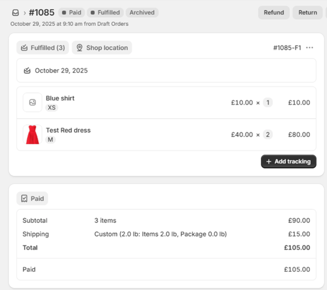 Let’s say an order is created and fulfilled on October 29, 2025. Given the 11-day return window setting, the default return deadline would be November 9, 2025