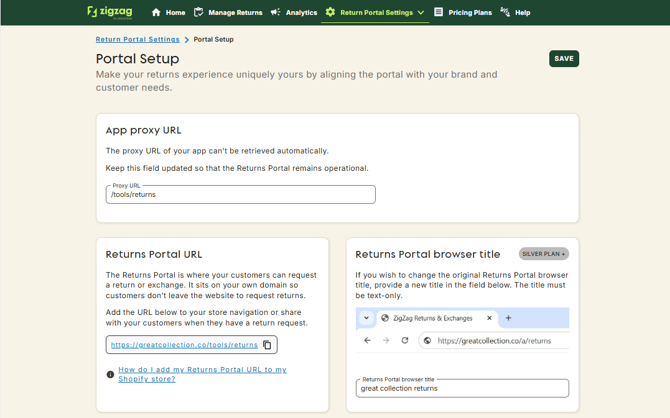 1. Log in to ZigZag Returns and Exchanges App and in the navigation bar, go to Return Portal Settings > Portal Setup.