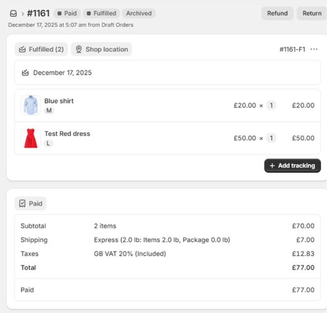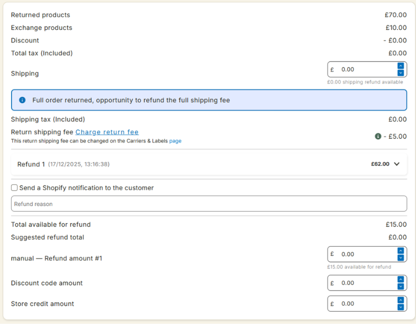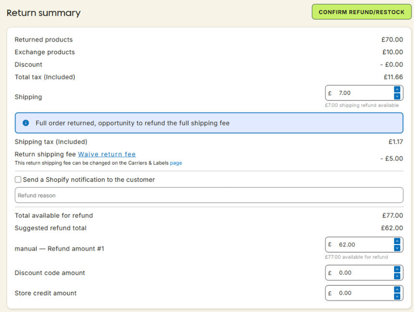Once the "Confirm Refund/Restock" button is pressed, the system will process the refund for the customer. The Return Summary will be updated to reflect the refund details. If necessary, manual adjustments can still be made for any remaining balance in Shopify, such as the £15 difference, which includes:
