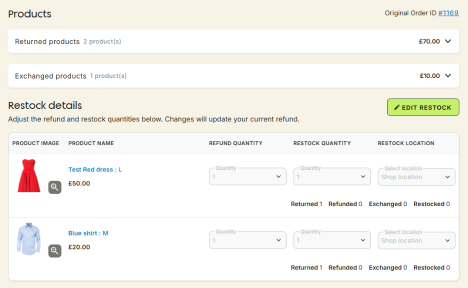 The first action is selecting the quantities of products that need to be restocked and refunded. By default, the quantities will match the number of return products. However, you can modify these quantities by pressing the "Edit Restock" button.