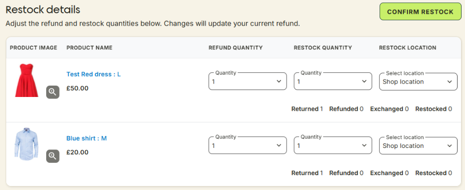 Once the restocking quantities are adjusted (if necessary), press the "Confirm Restock" button. Please note that changes here will impact the refund amount calculations. Specifically: