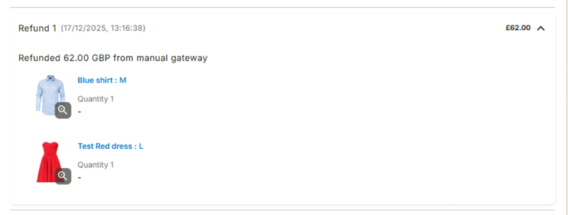 In this example, the total value of the returned products is £70 (Red dress: £20, Blue shirt: £50). The exchange item price is £10 less than the returned Blue shirt. Additionally: